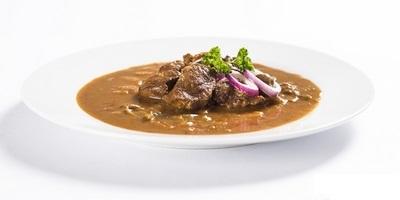 Bravčové mäso, z menšej časti i mastné, pokrájame na väčšie kocky rovnakej velkosti a zbavíme chrupiek a hrubých koží. Treba dbať na to, aby na kocke nebolo viac tuku ako chudého mäsa. V masti sa do žlta upraží cibuľa pokrájaná nadrobno, hneď nato sa dá mäso a dobre sa mieša. Medzitým sa posolí, opaprikuje a upraví korením a rascou. Podla potreby sa prileje silný vývar z kostí. Len čo je mäso opražené, hoci je vnútri ešte surové, hneď sa vyberie, ale šťava sa ešte nechá variť a podla chuti sa upraví. Plní sa do ľubovoľných plechoviek a dolieva gulášovou šťavou. V plechovke nech nie je viac mastného ako chudého mäsa. Dobre uzavreté sterilizujeme.